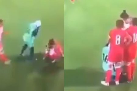 Futbolistas cubren a contricante que se le cae hiyab. (Video)